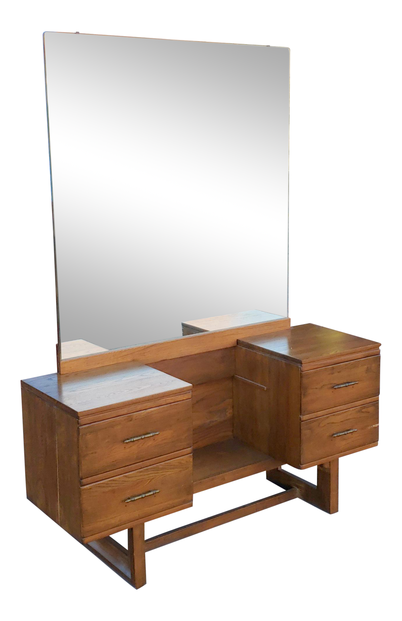 Vintage 1950s Oak Art Deco Style Unusual Bedroom Vanity W Mirror