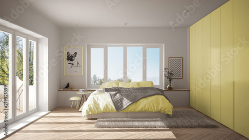 Scandinavian White And Yellow Minimalist Bedroom With Panoramic