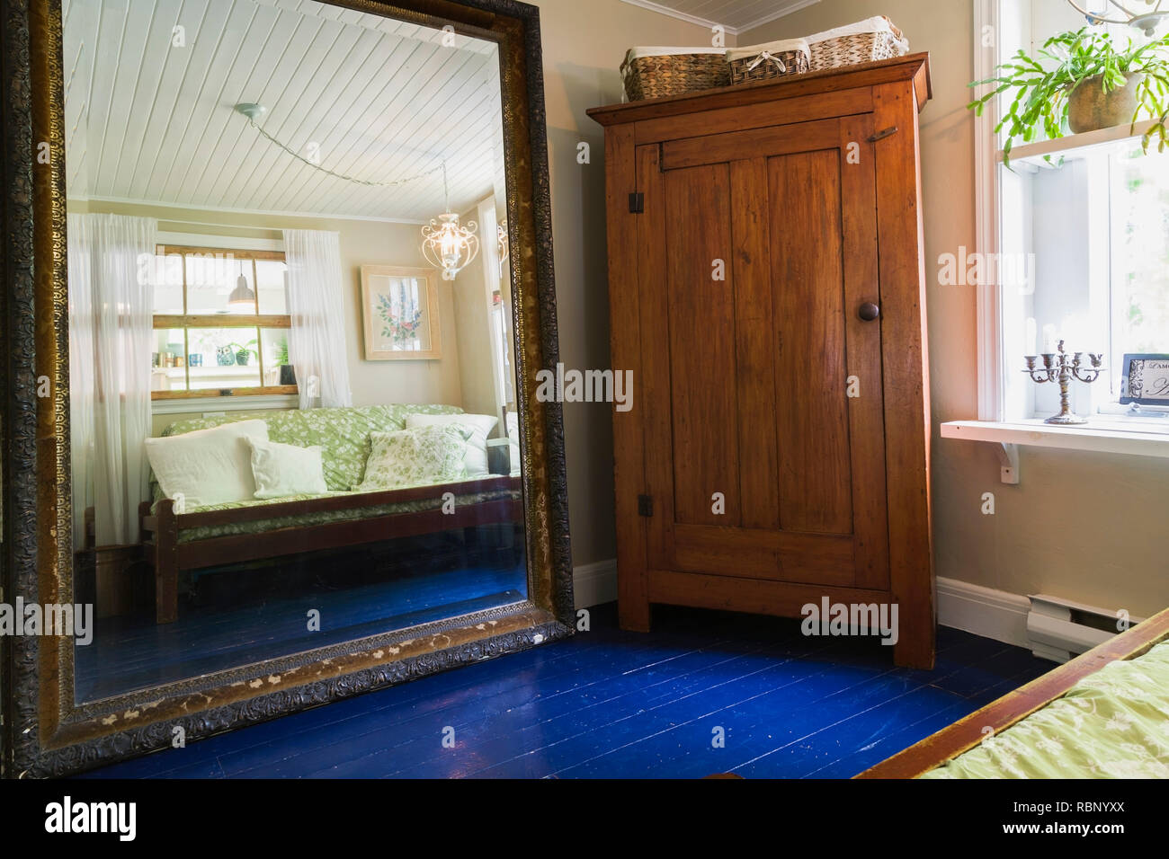 Guest Bedroom With Wood Frame Single Bed Large Mirror And Old