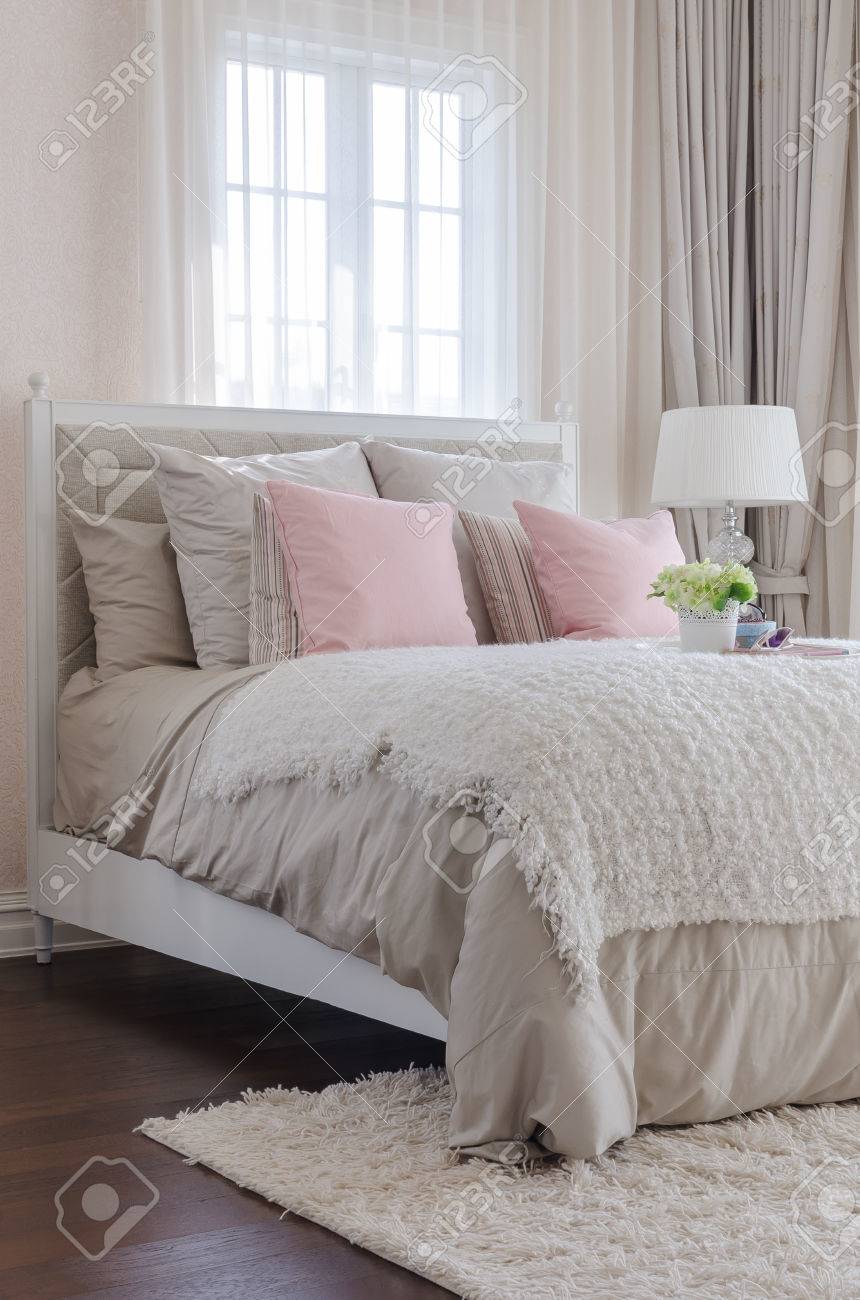 Luxury Bedroom With Pink Pillows On Bed At Home Stock Photo